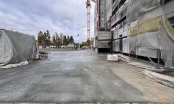 Na niższych kondygnacjach wykonywane są wylewki – obecnie na drugim i trzecim piętrze – a także rozpoczęto prace wykończeniowe w obrębie klatek schodowych i biały montaż elementów elektryki.