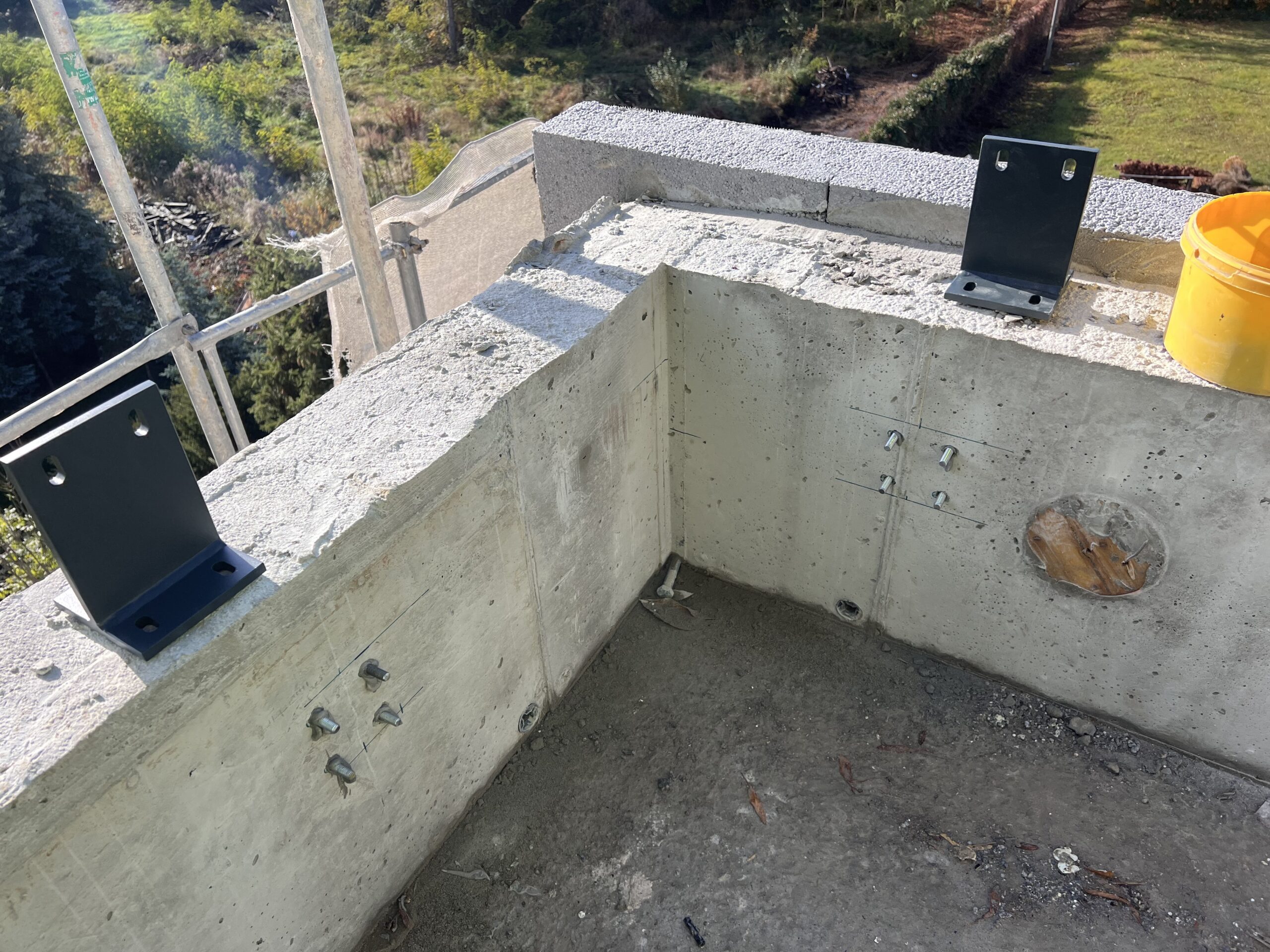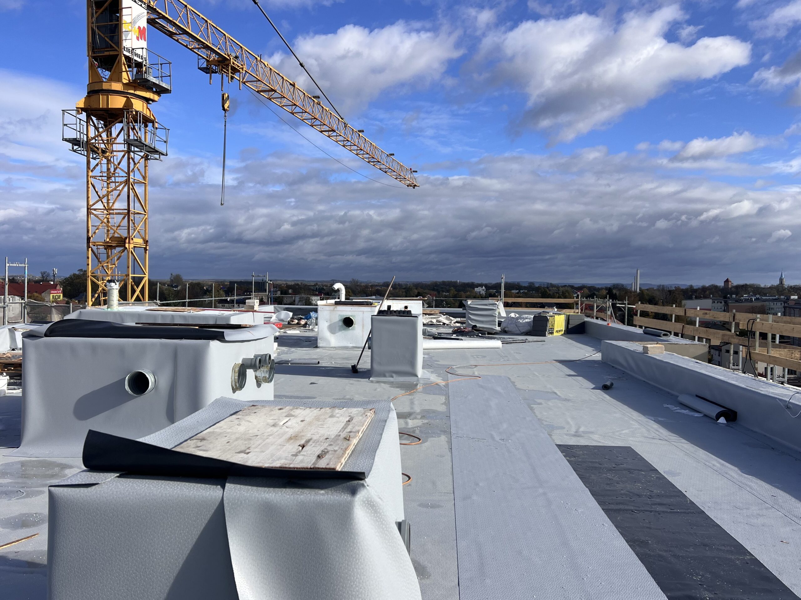 Ekipy wykonawcze koncentrują się obecnie na realizacji kluczowych etapów konstrukcyjnych oraz instalacyjnych. Na stropodachu prowadzone są obróbki blacharskie i obróbki kominów, natomiast w garażu wykonywana jest termoizolacja oraz hydroizolacja stropu.