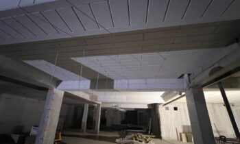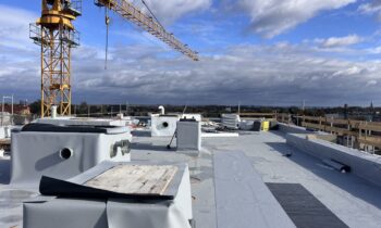 Na piątym piętrze trwają intensywne prace instalacyjne – sanitarne, wentylacyjne oraz elektryczne – równolegle z tynkowaniem pomieszczeń. Kontynuowane są również roboty związane z pionami kanalizacji deszczowej.
